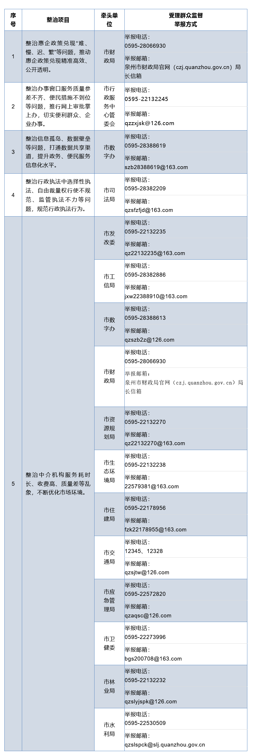 為方便群眾參與監督和反映問題,現將5個整治項目和受理群眾監督舉報方式公布如下: