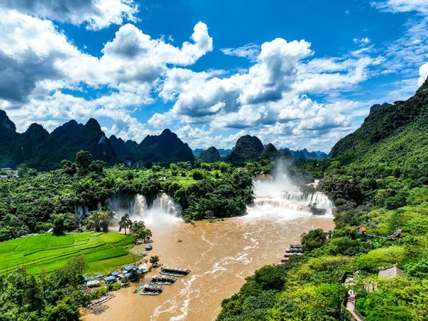 六月盛夏,經(jīng)過一場降雨,廣西壯族自治區(qū)大新縣迎來好天氣。在德天跨國瀑布遠(yuǎn)處眺望,綠樹成蔭,秧苗青青,蔚藍(lán)天空如同一幅巨大的澄澈畫布,與氣勢磅礴的“黃金瀑布”交相輝映,構(gòu)成了一幅令人贊嘆的絕美夏日生態(tài)畫卷。(廣西壯族自治區(qū)大新縣紀(jì)委監(jiān)委供 覃斯 攝)