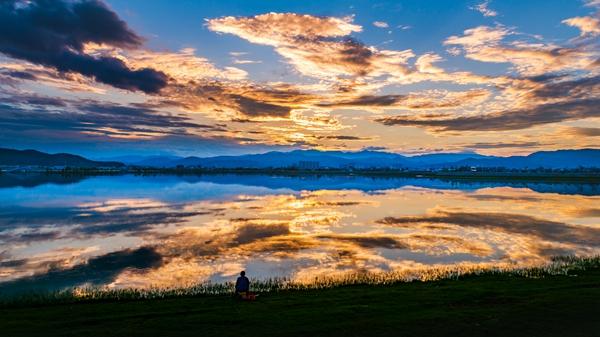 傍晚時分,絢麗的彩云倒映在湖面上,釣魚者靜坐岸畔,宛如一幅流動的夢幻錦緞。(云南省祥云縣紀(jì)委監(jiān)委供 芮鴻壽 攝)