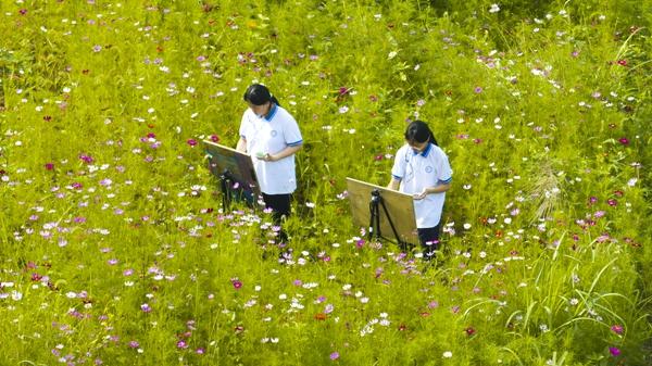 六月花開滿人間。浙江省永康市永康六中勞動實(shí)踐基地內(nèi)的格桑花與百日菊迎來了盛花期,學(xué)生們走進(jìn)花海,用畫筆描繪夏日美景。(浙江省永康市紀(jì)委監(jiān)委供 盧斌 攝)
