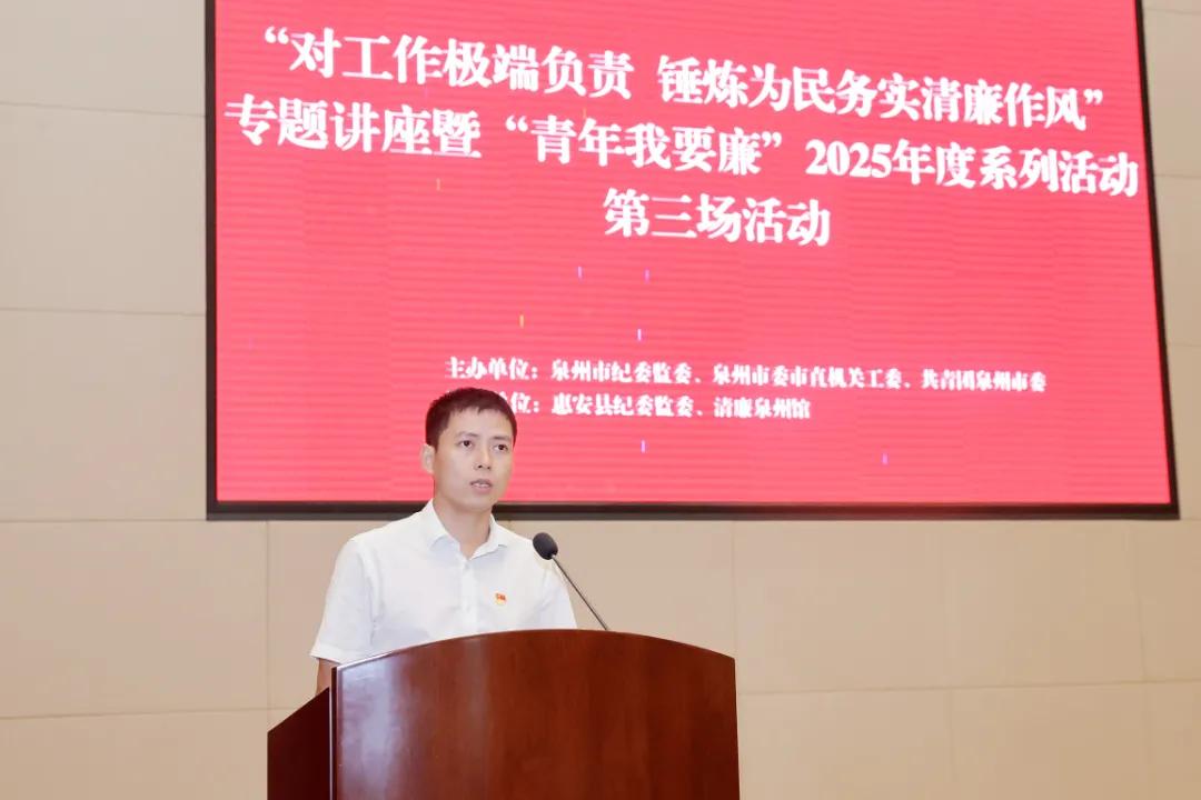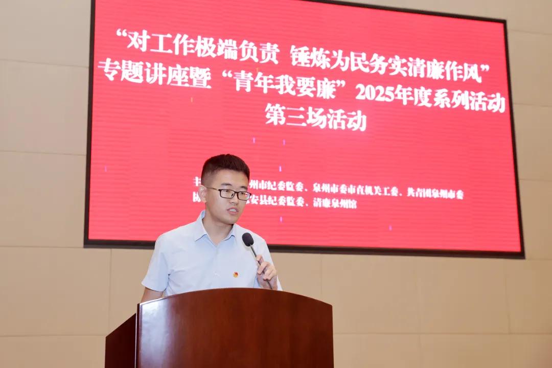 7月25日,由市紀委監委、市委市直機關工委、團市委主辦,惠安縣紀委監委、清廉泉州館協辦的“對工作極端負責 錘煉為民務實清廉作風”專題講座,暨“青年我要廉”2025年度系列活動第三場活動舉辦,邀請全國優秀共產黨員、惠安縣人大常委會原助理調研員陳欠水分享濟困助殘的生動故事。來自市直各單位、省部屬駐泉單位、惠安縣和“青廉風采崗”展示單位的200多名青年干部參加活動。